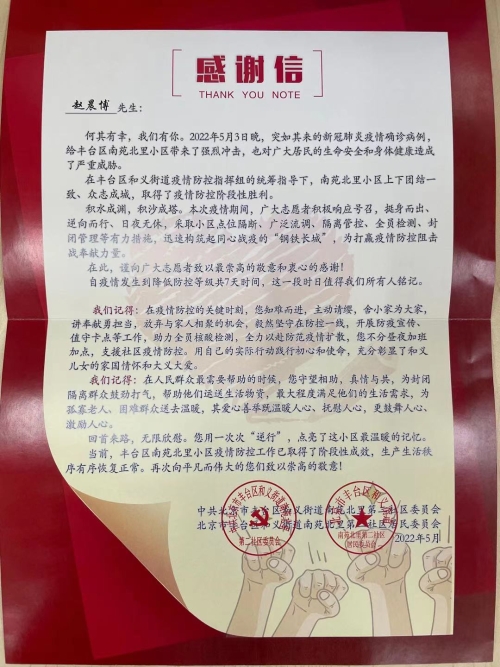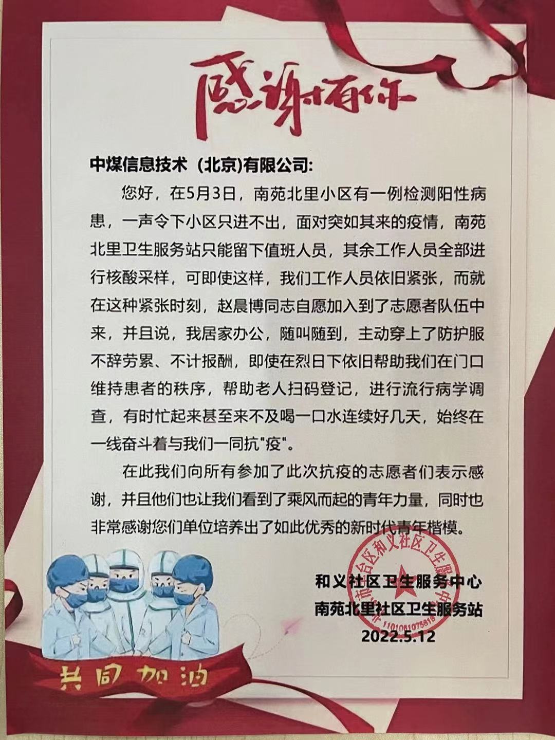 疫情当前,青年先行。在这个特殊时期,我们收到了一封来自北京市丰台区和义社区卫生服务中心及南苑北里社区卫生服务站的感谢信,肯定了信息公司团员青年赵晨博在社区疫情防控志愿工作中所作出的贡献。