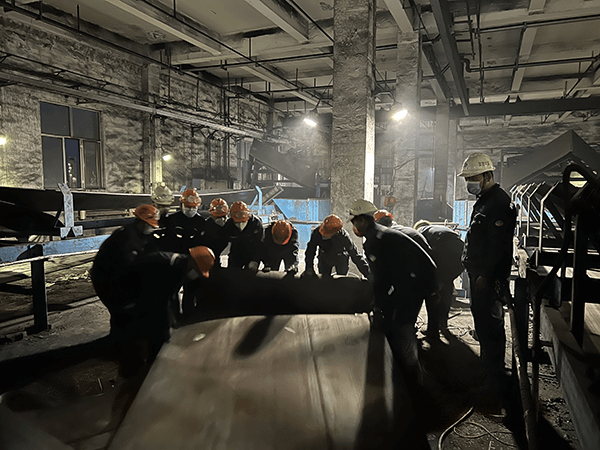 新皮带安装后旧皮带如何拆除是个难题,105B筒仓皮带长达205米,宽度1.8米,为厂区最大的皮带,旧皮带拆除难度非常大,为了保证检修进度,该项目部领导班子带领项目部管理人员及各专业负责人加班加点对旧皮带进行拆除,大家对旧皮带进行分段切割,然后进行分段拆除,在长长的输煤廊中,大家团结协作、分工合作,群策群力。