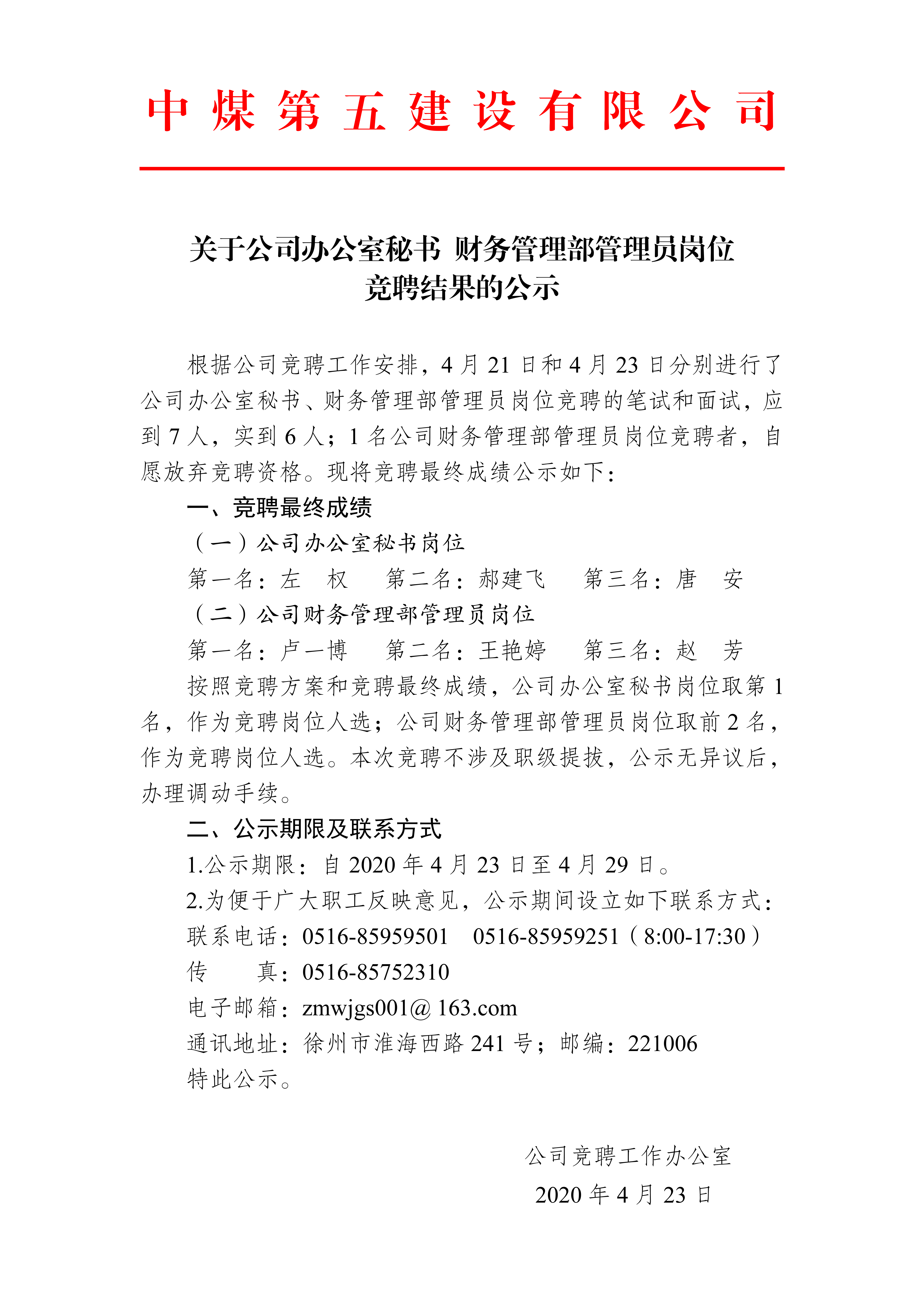 公司办公室秘书 财务管理部管理员岗位竞聘结果公示