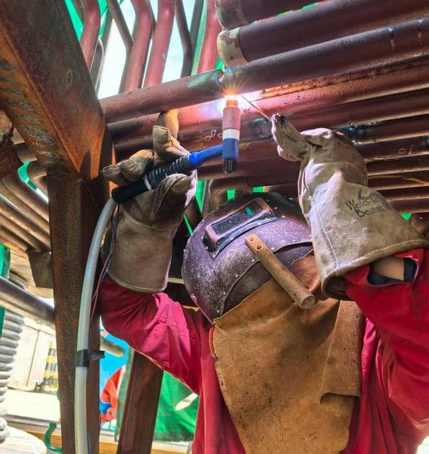 走进现场,一幅热火朝天的奋斗画卷映入眼帘。焊接班组师傅半蹲在滚烫管道旁,面罩下的脸庞被焊花与汗水映亮。他们手持焊枪,在近千度电弧光与高温管道的双重“烤”验下,屏息凝神完成每道焊缝。“高温下焊接口温度变化更敏感,一丝疏忽就影响质量。”二十年经验的焊工李师傅抹去汗水,浸透汗水的防护手套仍稳稳把控焊枪角度,“咱们干的是百年工程,质量这根弦绝不能松。”