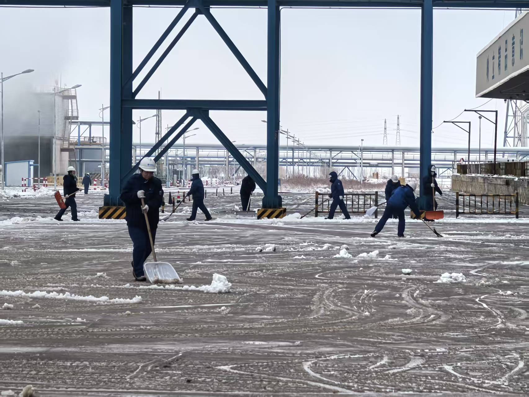 面对昼夜连降的积雪,志愿者们不畏严寒对重点区域进行清理。在清扫过程中,志愿者们密切配合,干劲十足成为各厂区一道亮丽的风景线。