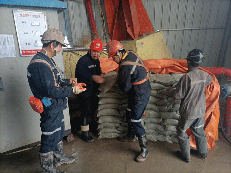 14:00,胡家河风井项目部雨季“三防”气象收集组发出预警,下午咸阳地区将有强降雨,局部地区降雨量将达到80mm。16:00地面积水已经开始流向井口,救援演练指挥小组接到险情报告,立即下达抢险指令。一声令下,众人齐力出动。按照演练预案程序,抢险组、警戒协调组和后勤保障组抢险队员迅速集结,有序展开抢险工作。抢险组队员按照职责分工,应急封堵、抢险排水,用最短时间用防洪沙袋墙封堵井口,经过15分钟的团结协作,险情得到有效控制,演练结束。