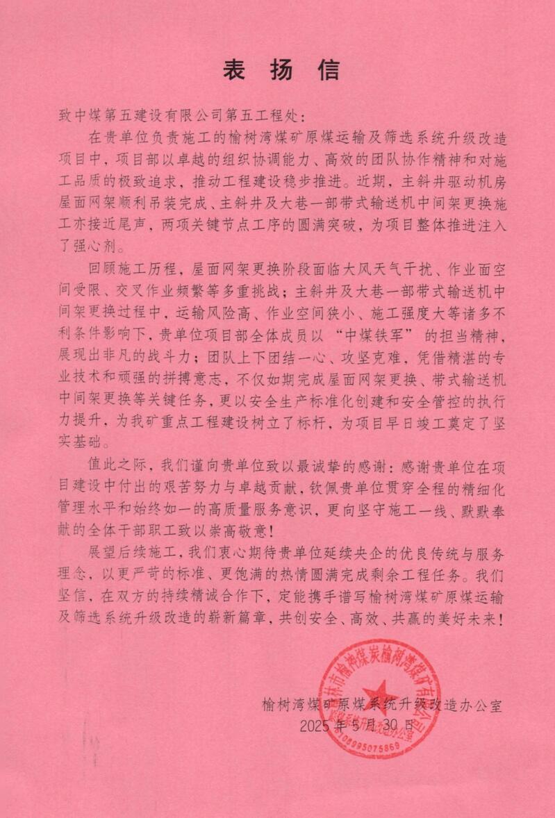 表扬信指出,五处榆能项目部面临大风天气干扰、作业面空间受限、交叉作业频繁、运输风险高、作业空间狭小、施工强度大等诸多不利条件,全体成员以“中煤铁军”的担当精神,展现出非凡的战斗力;团结一心、攻坚克难,凭借精湛的专业技术和顽强的拼搏意志,如期完成屋面网架更换、带式输送机中间架更换等关键任务。希望五处在后续施工中延续央企的优良传统与服务理念,以更严苛的标准、更饱满的热情圆满完成剩余工程任务。希望双方携手谱写新篇章,共创安全、高效、共赢的美好未来!