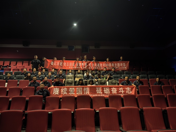 观影结束后,全体人员在影厅合影留念。“铭记历史,勿忘国耻”的条幅在镜头中央舒展。这一刻,历史与现实在光影中交汇,每一张肃穆的面孔都写满了传承的责任。
