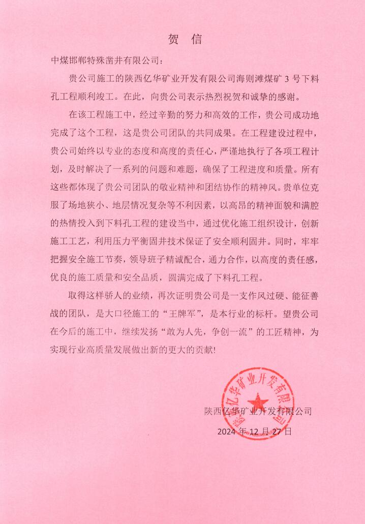 陕西亿华矿业开发有限公司在贺信中,对公司在大口径钻孔施工领域取得的成就给予高度评价,称赞中煤邯郸特凿公司是大口径施工行业的“王牌军”、“行业标杆”,凭借高度责任感和精湛的施工技术,及时解决一系列的问题和难题,确保了工程进度和质量。祝愿中煤邯郸特凿公司在今后的施工中,继续发扬“敢为人先,争创一流”的工匠精神,为实现行业高质量发展作出新的更大贡献。(文/张欣 影/杨宾海)